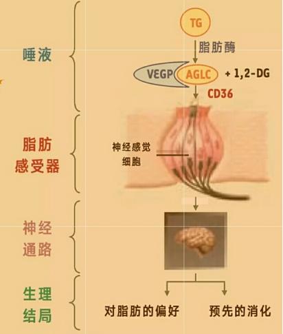 2005年,法国勃艮第大学(UniversitédeBourgogne)的研究[3]发现,小鼠的舌头上有一种名为CD36的受体。这种受体能和脂质特异性结合,并引发脂肪消化的早期分泌反应,导致小鼠对于脂质的“偏爱”,而缺乏这种受体的小鼠则没有类似的反应。实验表明,这种受体可能是脂质受体,是“脂肪味”的感受器。